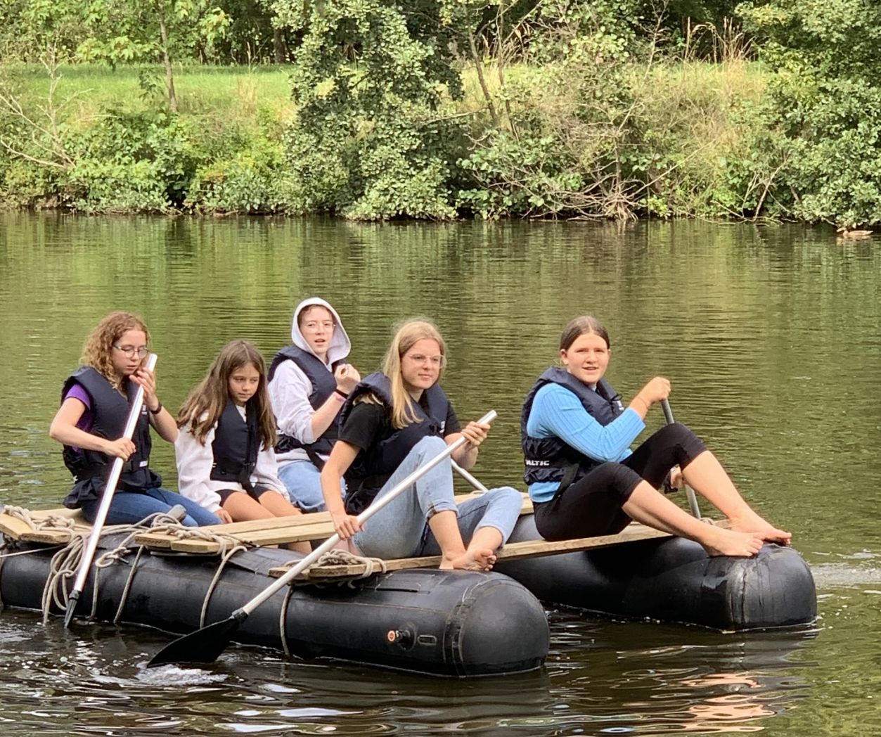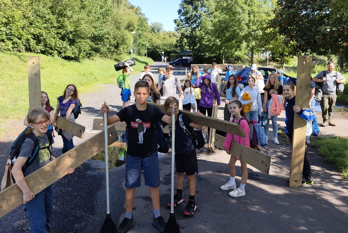 Der Samstag war unser Ausflugstag, es ging mit dem Bus nach Bad Hersfeld. Dort wartete bereits Martin (Erlebnispädagoge von „Mit Sack und Pack“) auf uns. Nach ein paar lustigen und teambildenden Spielen halfen die Kinder fleißig dabei, Holzbretter, schwarze Säcke, Seile und Schwimmwesten ans Ufer des Fuldasees zu tragen. Dort erfuhren sie dann endlich, dass sie heute in zwei Gruppen jeweils ein Floß bauen durften, mit dem es später auch auf den See gehen sollte. Die Kinder waren sehr fleißig, während die Betreuer sich eine kleine Pause gönnen durften, denn Martin hatte alles im Blick und unterstützte die Gruppen.