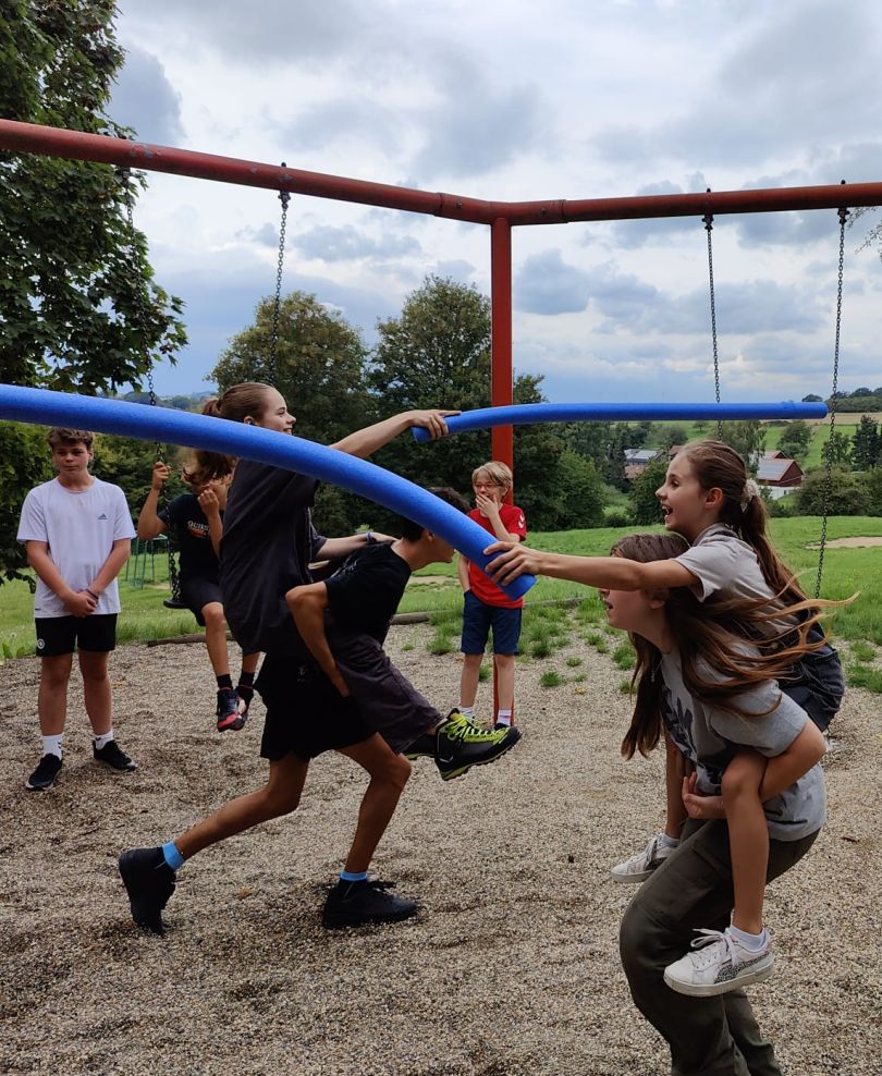 Die Zimmer wurden bezogen und die Freizeit bis zum nächsten Programmpunkt genutzt. Schnell entdeckten die Kinder die Schaukeln, die zum Mittelpunkt der Freizeitbeschäftigung werden sollten. Bevor wir mit der zweiten Runde Kennenlernspiele begannen, legten wir zusammen die Regeln fest, die den Kindern und uns für unserer gemeinsame Zeit wichtig waren. Dann ging es in die zweite Runde der Kennenlernspiele. Beim Kennenlern-Bingo ging es darum, einander anzusprechen und persönliche Aspekte abzufragen. Als Abschluss zeigten allen beim Spiel „Zipp-Zapp“, wie gut sie sich die Namen der anderen schon eingeprägt hatten.