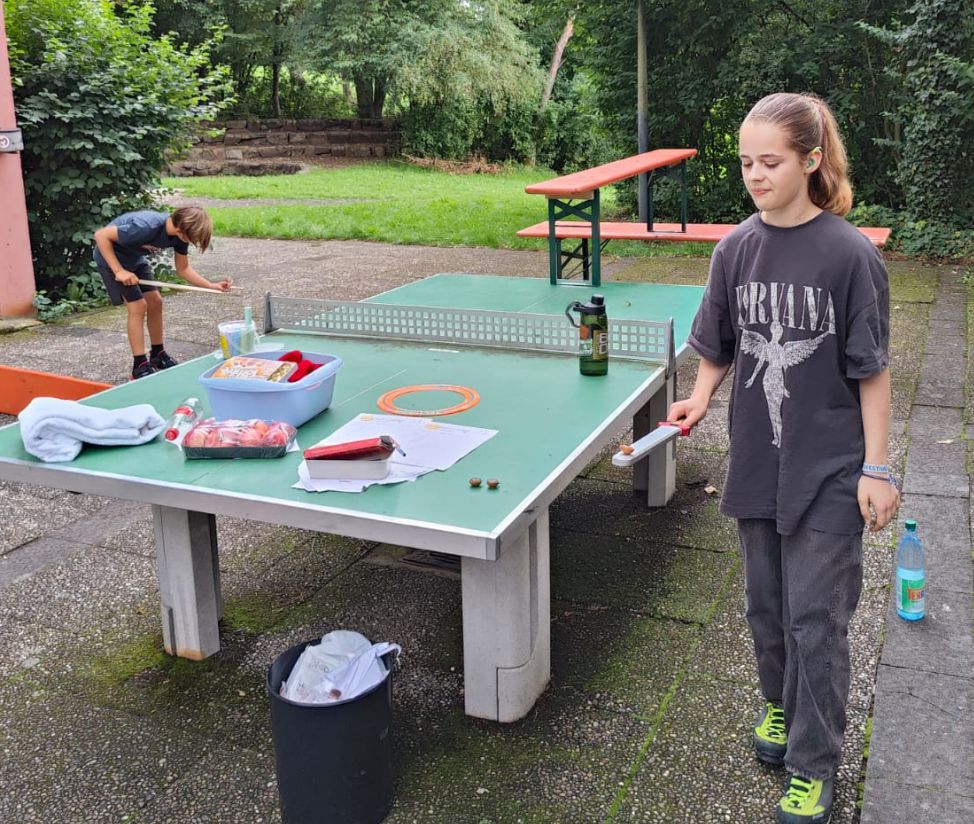 Bevor wir den Abend mit einem kleinen AG-Angebot (Cornhole-Turnier, Freundschaftsbänder knüpfen und Gesellschaftsspiele spielen) ausklingen ließen, starteten wir unser Freizeitübergreifendes „Mörderspiel“, bei dem jeder den Namen seines „Opfers“ und eine „Tatwaffe“ (Becher, Stock, Stuhl) bekam, die dem Opfer in einem unbeobachteten Moment überreicht werden musste. Hatte man sein Opfer erfolgreich um die Ecke gebracht, erhielt man den Namen des Opfers, sowie seine Tatwaffe. Der erste Tag endete mit den Abendkreisen auf den Zimmern, in denen der Tag reflektiert, sich über andere Themen ausgetauscht oder gemeinsam gespielt wurde.